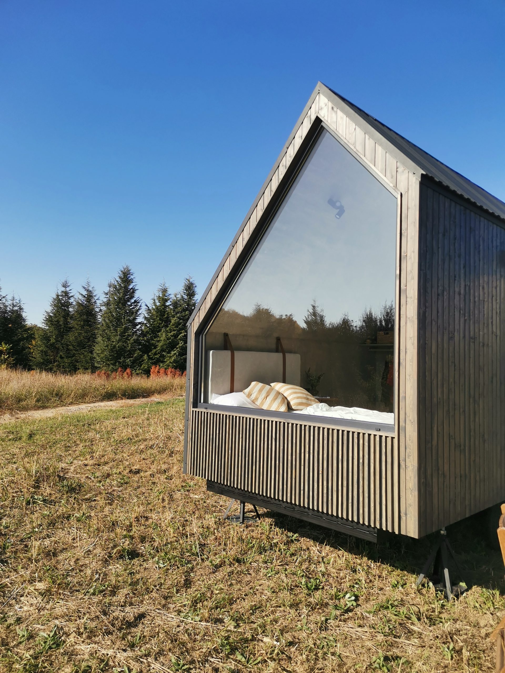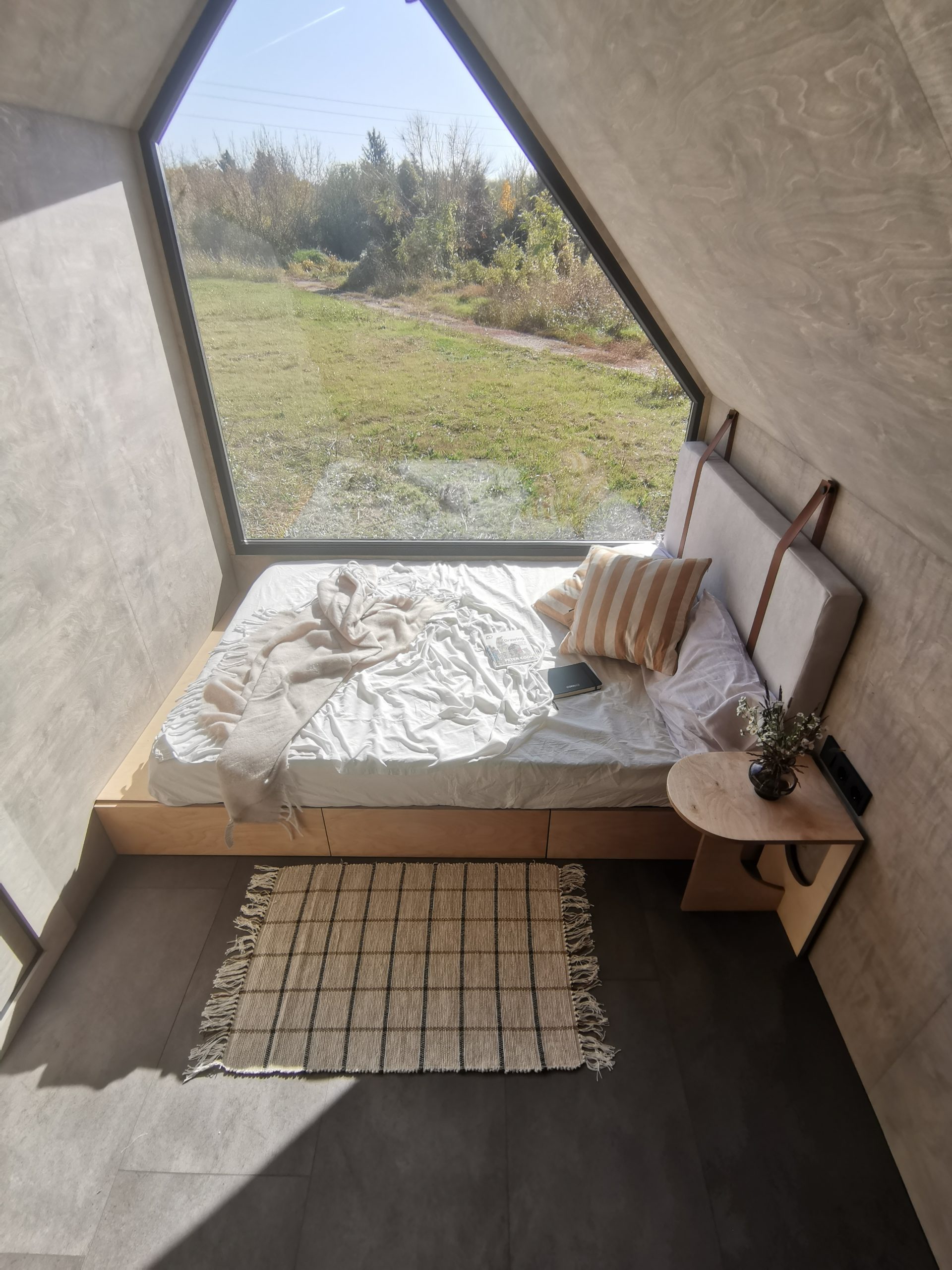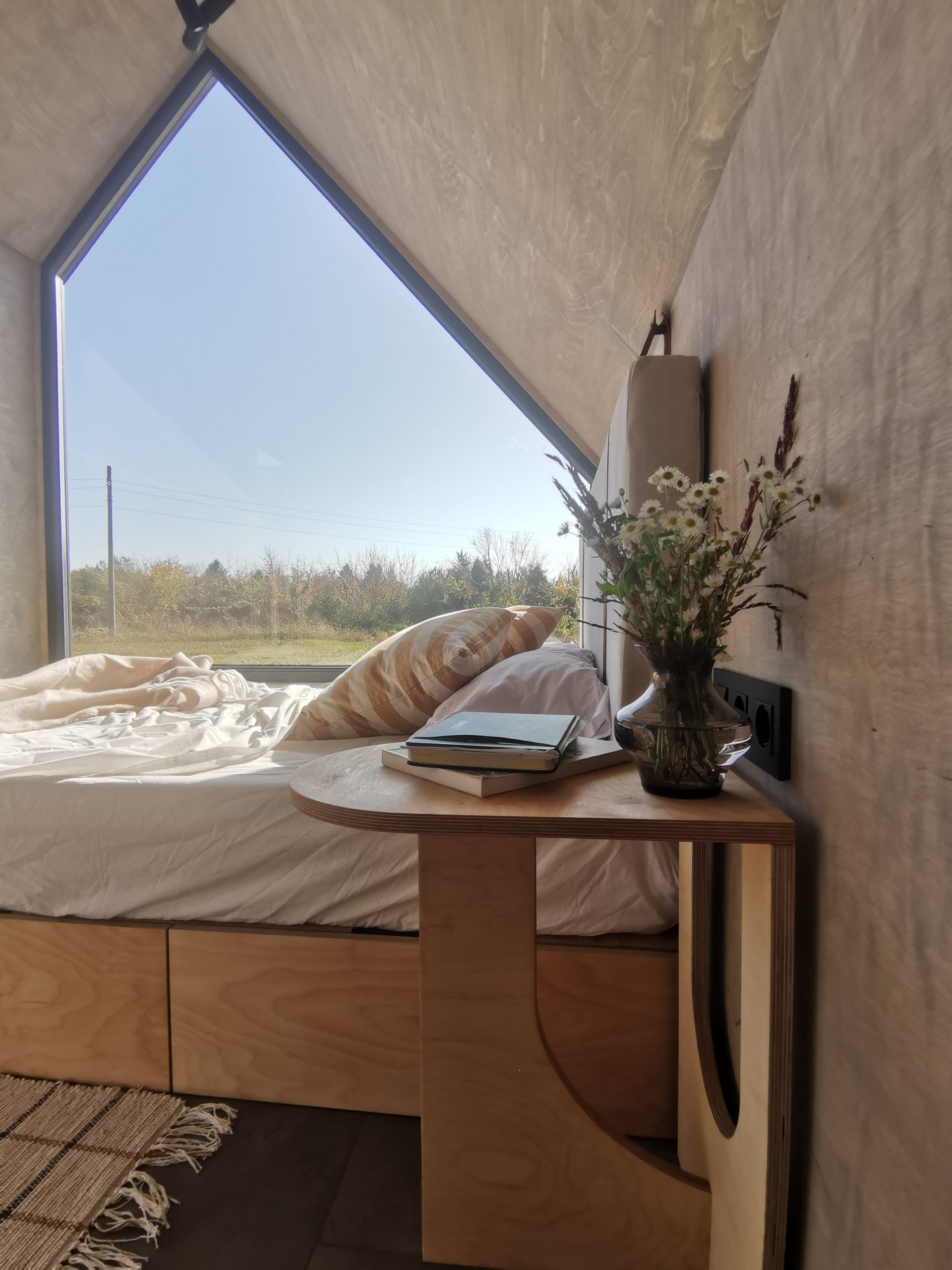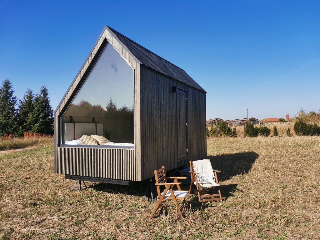 Der Mini Pod lebt von seiner markanten, fast skulpturalen Erscheinung und der asymmetrischen Stirnseite mit großem Panoramafenster. Genau daraus entsteht das eigentliche Urlaubserlebnis, morgens mit Ausblick aufzuwachen. Zugleich besitzt das Modell jene unverwechselbare Form, die Aufmerksamkeit erzeugt und Gäste dazu einlädt, ihren Aufenthalt auf Social Media zu teilen.